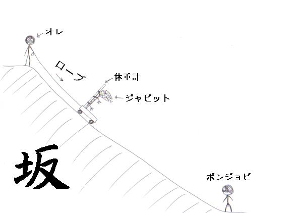 ボンジョビを近所の坂の下に連れてって、オレは坂の上に行くわけ。そこであらかじめキャスターつきの体重計に結わえておいたジャビットを坂の下にそろそろとロープで下ろしてやるんだ。こうすると、遠目からならジャビットが自走してるように見えるだろ?