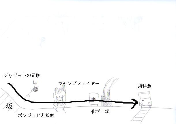 案の定ボンジョビは大喜び。坂の下で喜びのダンスを踊り狂ってるよ。あんなにスパークしてるボンジョビを久々に見て感動してさ。ついついジャビットを自走させるスピードを速めすぎたんだな。ロープをうっかり離しちゃったんだ。好事魔多しってやつ。ジャビットを乗せた体重計が『オーメン3』の乳母車みたいに猛スピードで坂道を疾走し始めた。これには踊ってたボンジョビも「え?」って顔してたね。そりゃそうだよ。通常のトカゲの3倍はあろうかってスピードでぐんぐん接近してくんだもんな。踊ろうか避けようか迷ってるみたいだった。危ない!